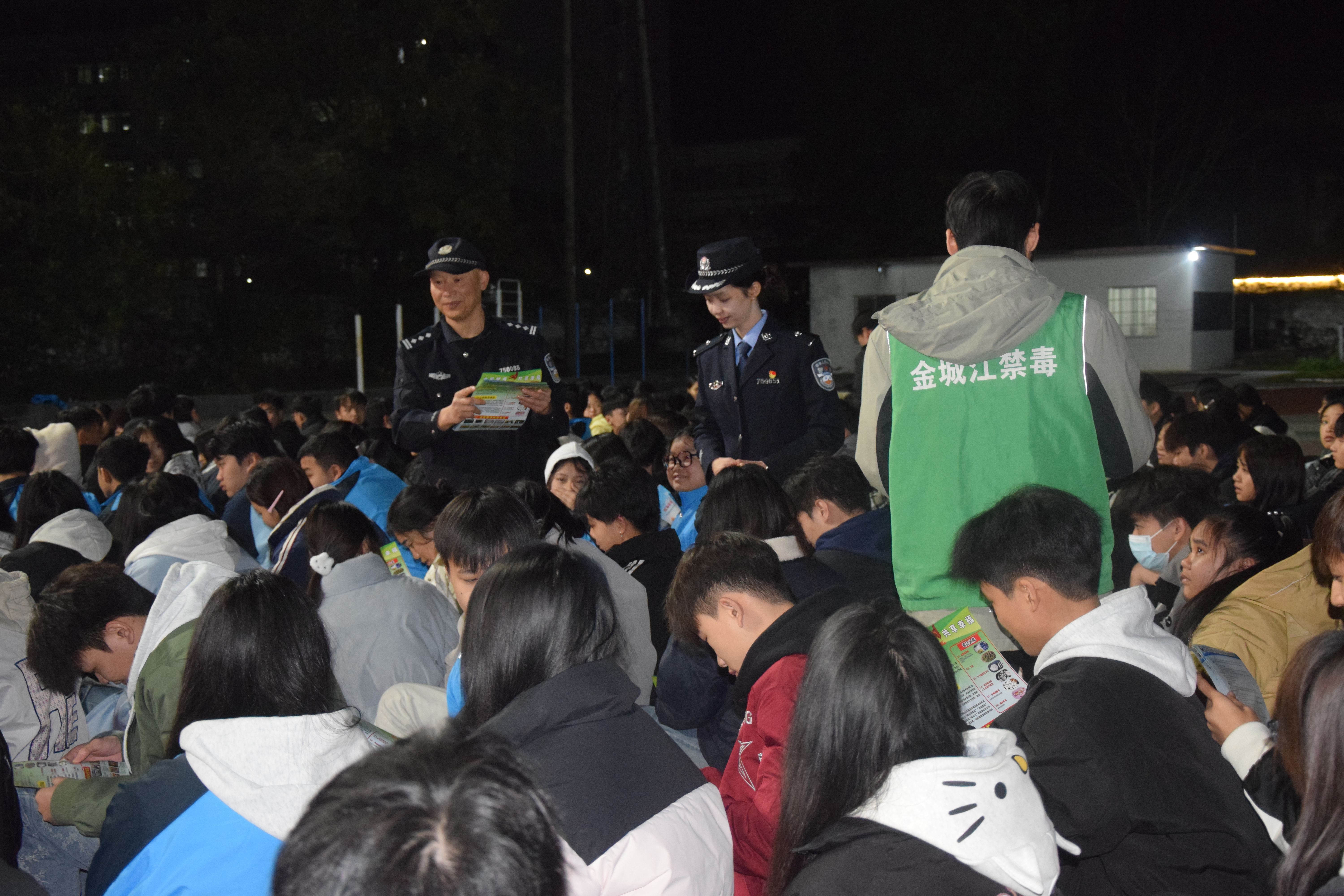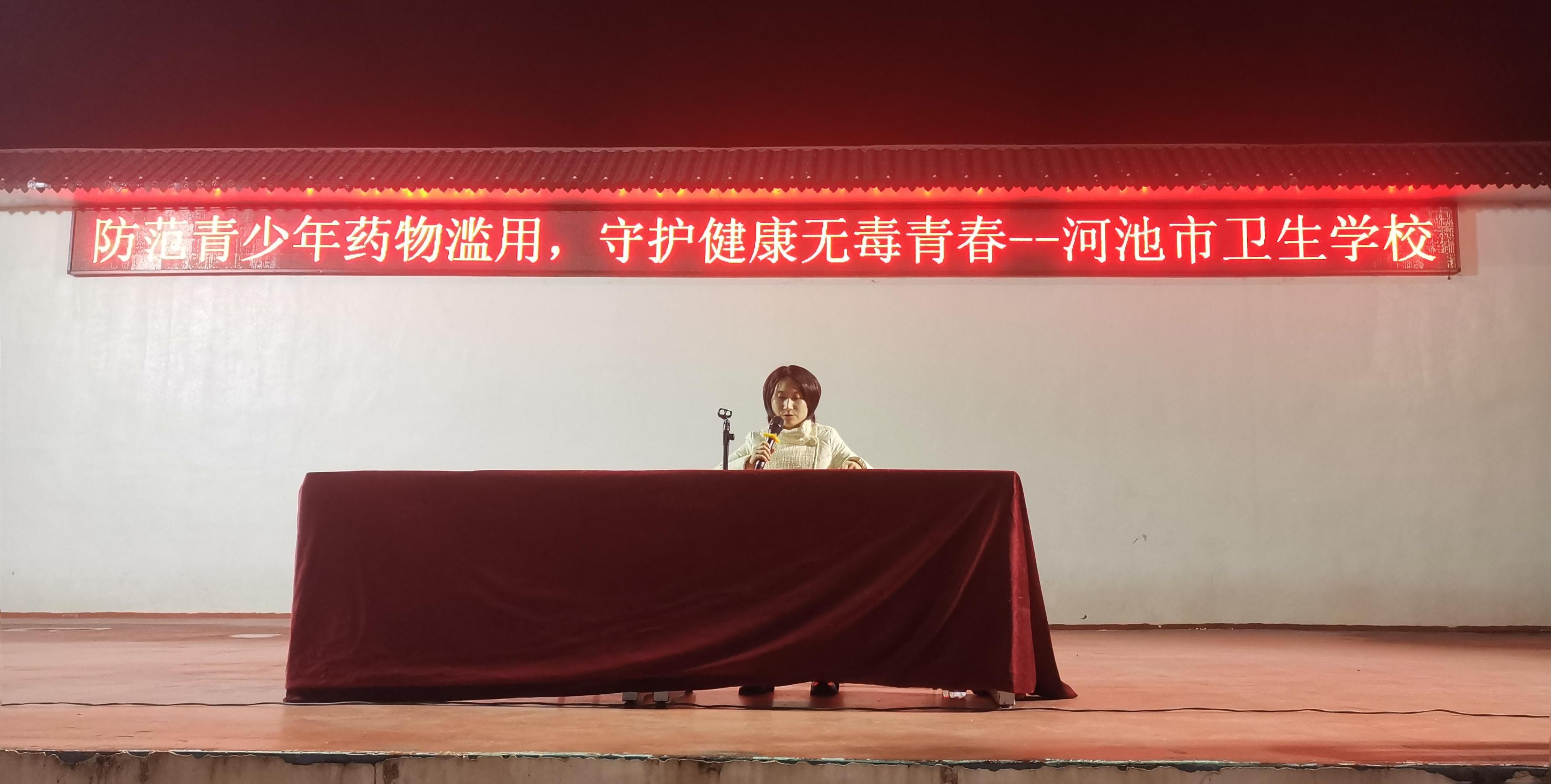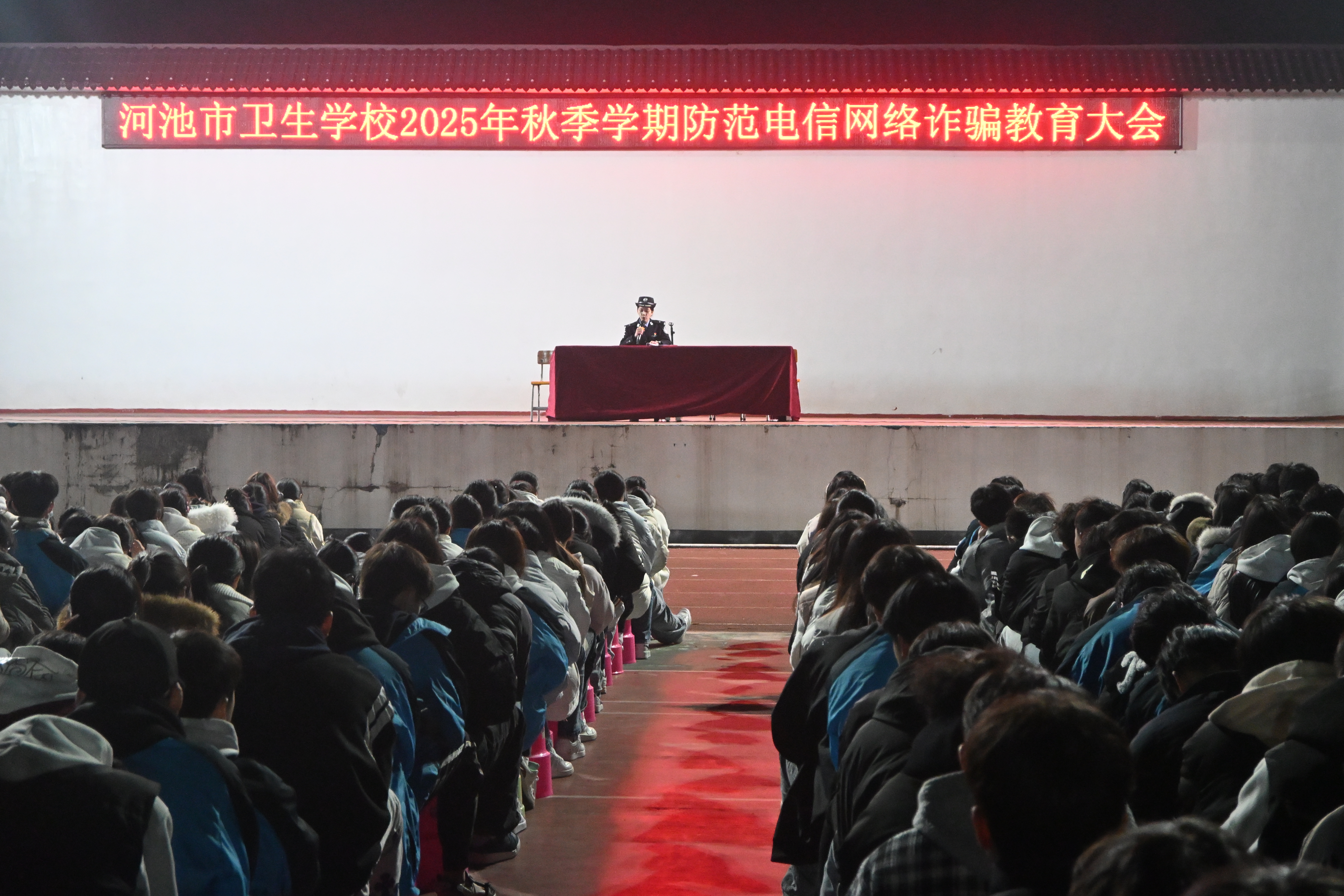 2025年12月4日晚19时,河池市卫生学校邀请东江镇政法单位走进校园,开展了一场综合法治宣讲活动。此次活动既是学校“12·4”国家宪法日主题教育的重要组成部分,也是切实维护校园安全的具体行动。东江镇派出所副所长宋衍霄、民警梁祎,东江镇司法所所长戴芳蕾以及东江镇副镇长韦殷师先后登台,围绕防范电信网络诈骗、国家安全教育、宪法知识普及及禁毒常识等内容,为全校师生带来了一堂生动而深刻的法治课。